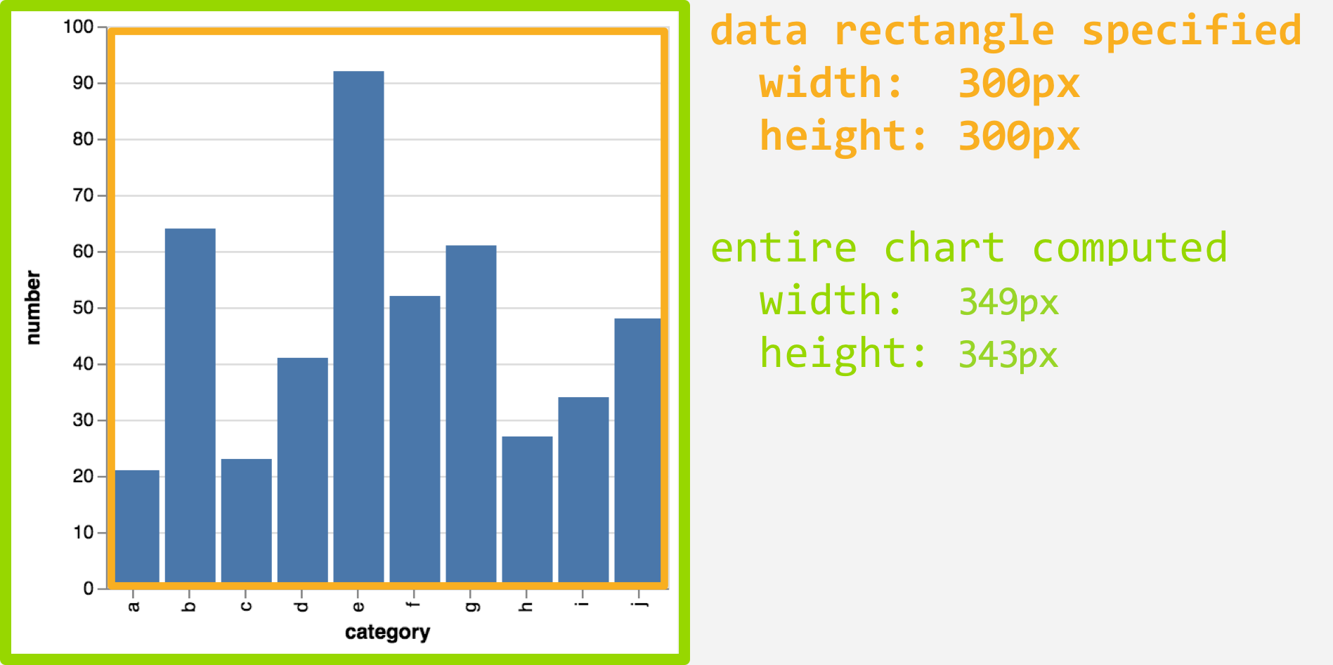 As you can see above, Vega adds on more “room” for axes, labels, legends, etc., so that the entire chart is 349 \(\times\) 343 pixels.