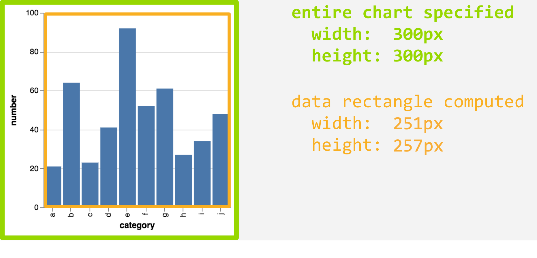 As you can see above, Vega takes into account the “room” needed for axes, labels, legends, etc., so that the data rectangle is 251 \(\times\) 257 pixels.